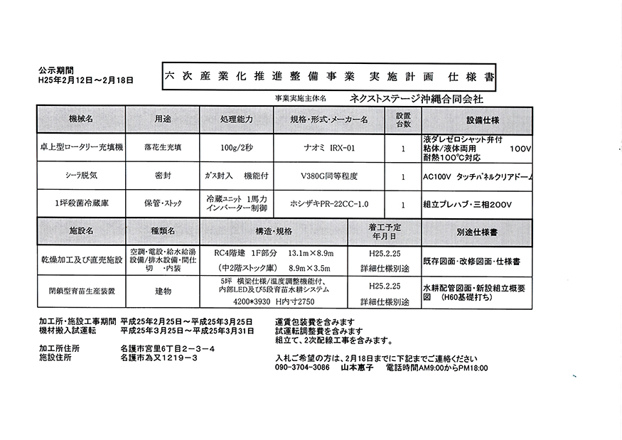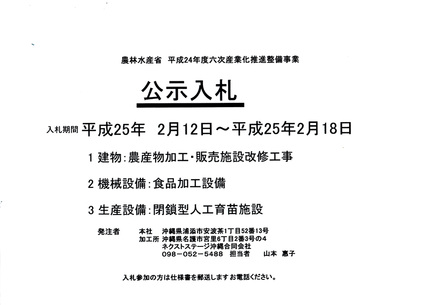 ただいま、宮里で加工場の内装工事をしてるということで、