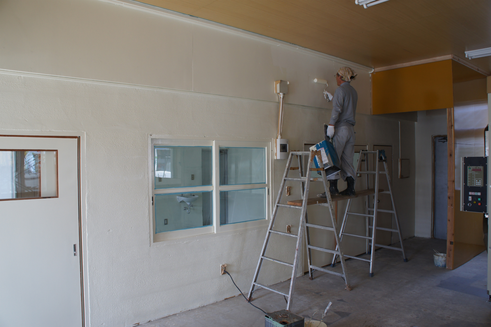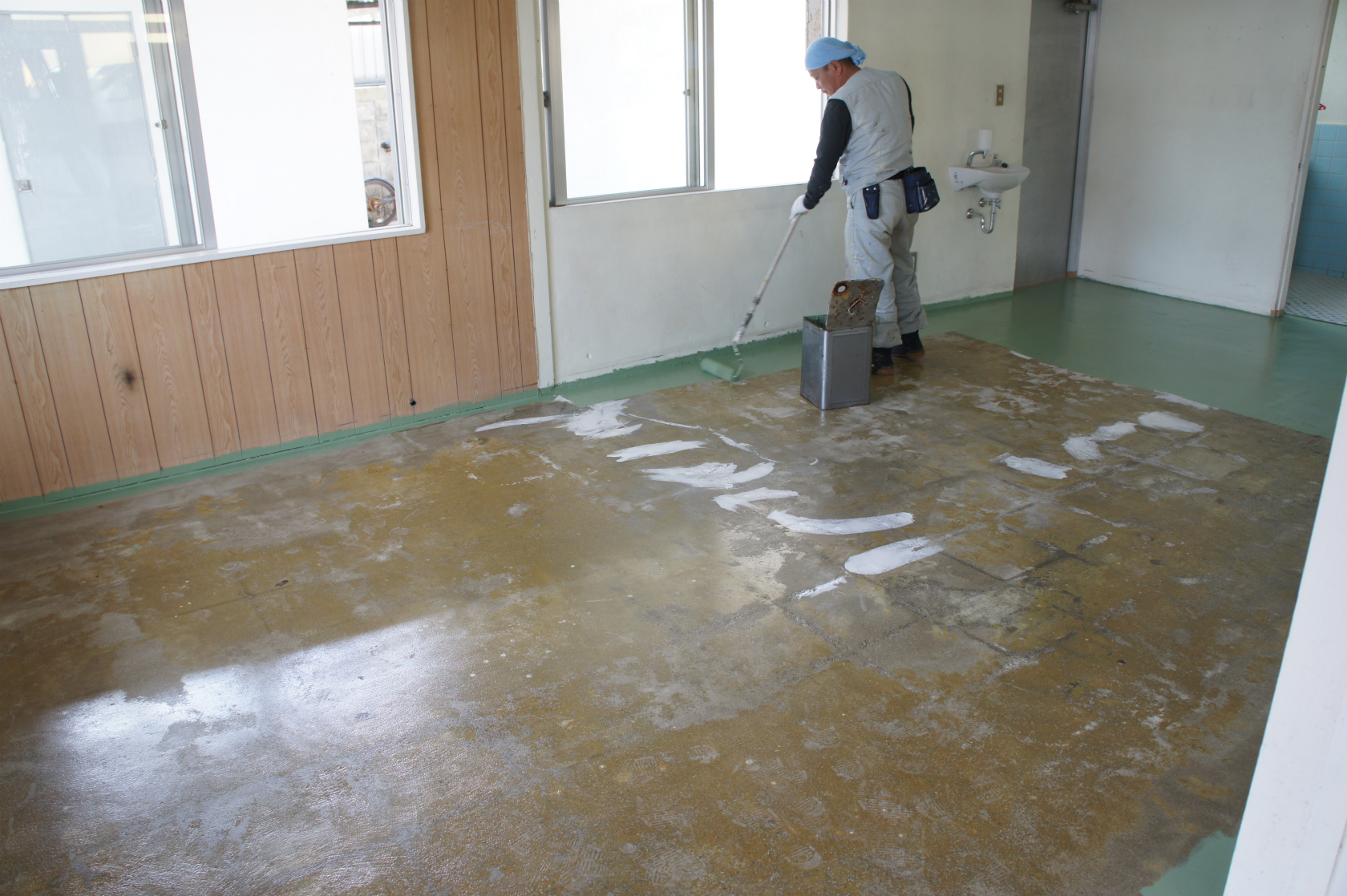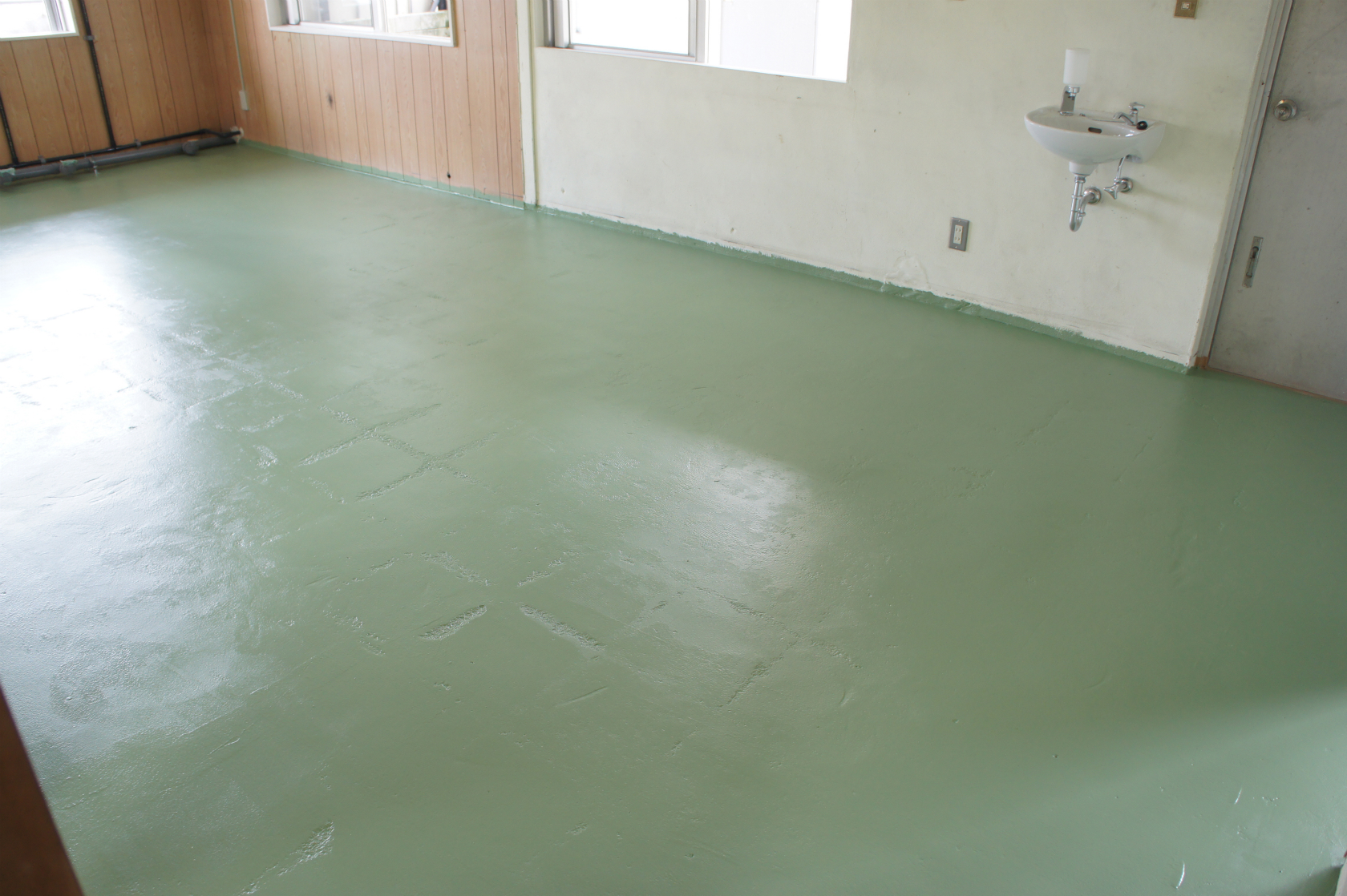 奥の加工場の床塗り。
