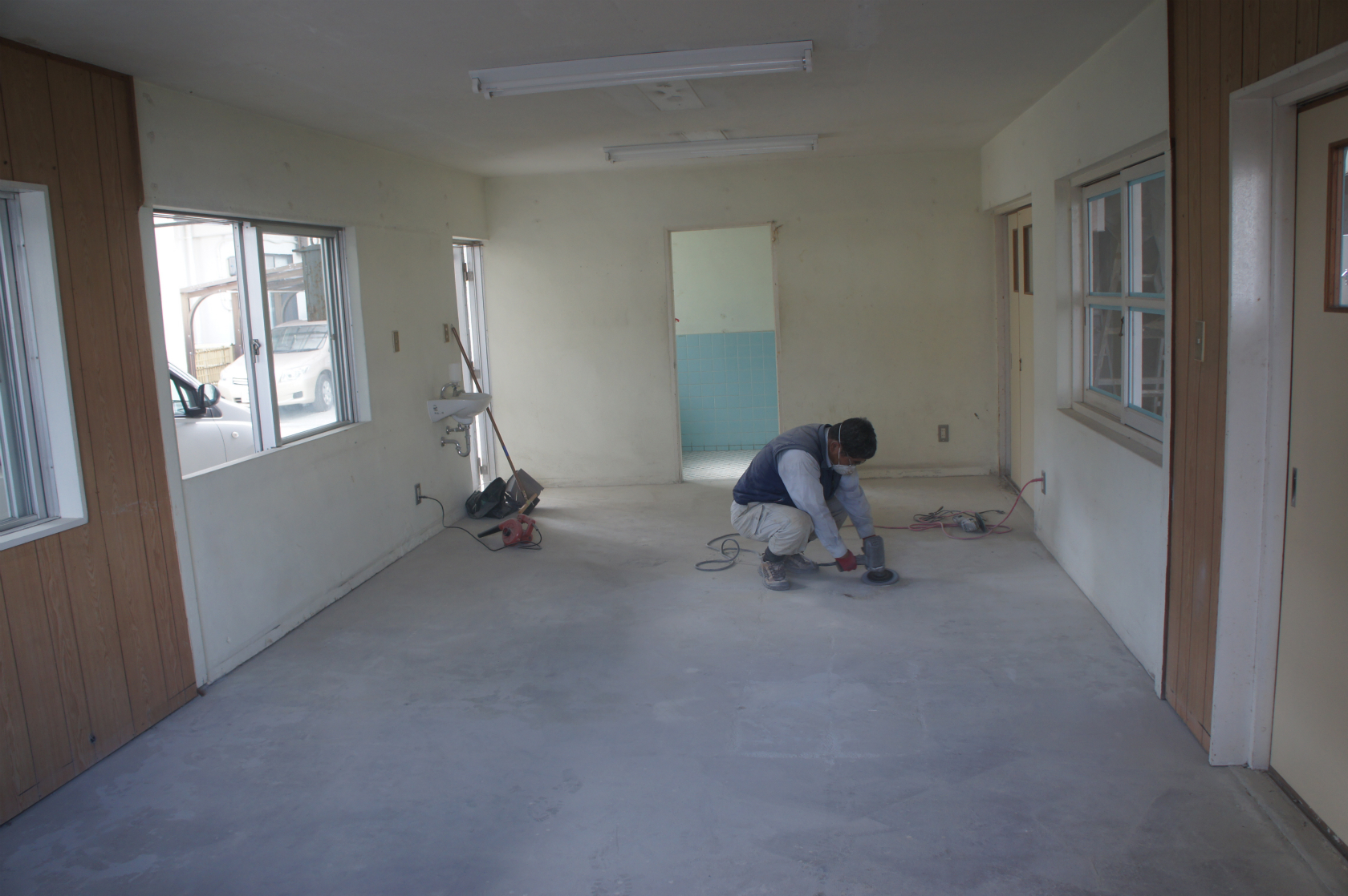 奥の加工場の床塗り。