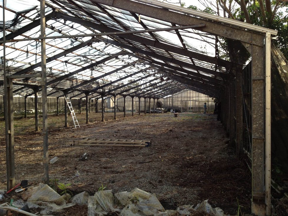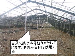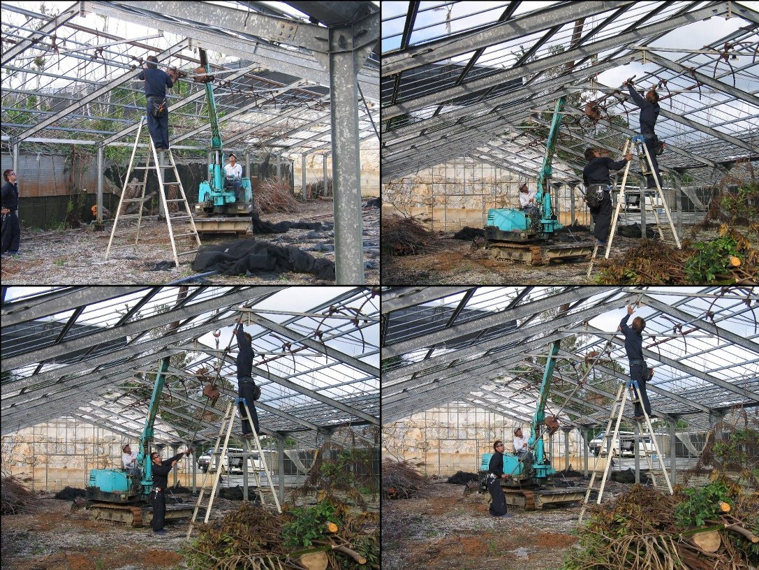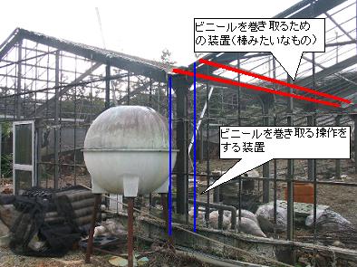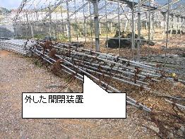 ハウス天井頂点付近にあるビニールの開閉装置の取り外しを主に行なっています。