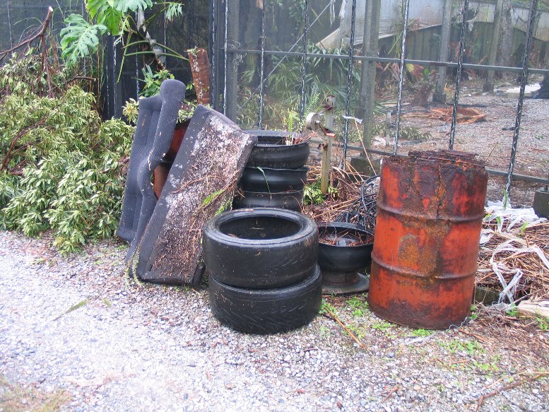 車のシート、タイヤ、廃タイヤで作った鉢ドラム缶、なぜか湯船。