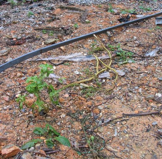 ハウスの修繕作業の影響でかわいそうな姿に。根は残っているので、トマトの生命力に掛けてみたい。